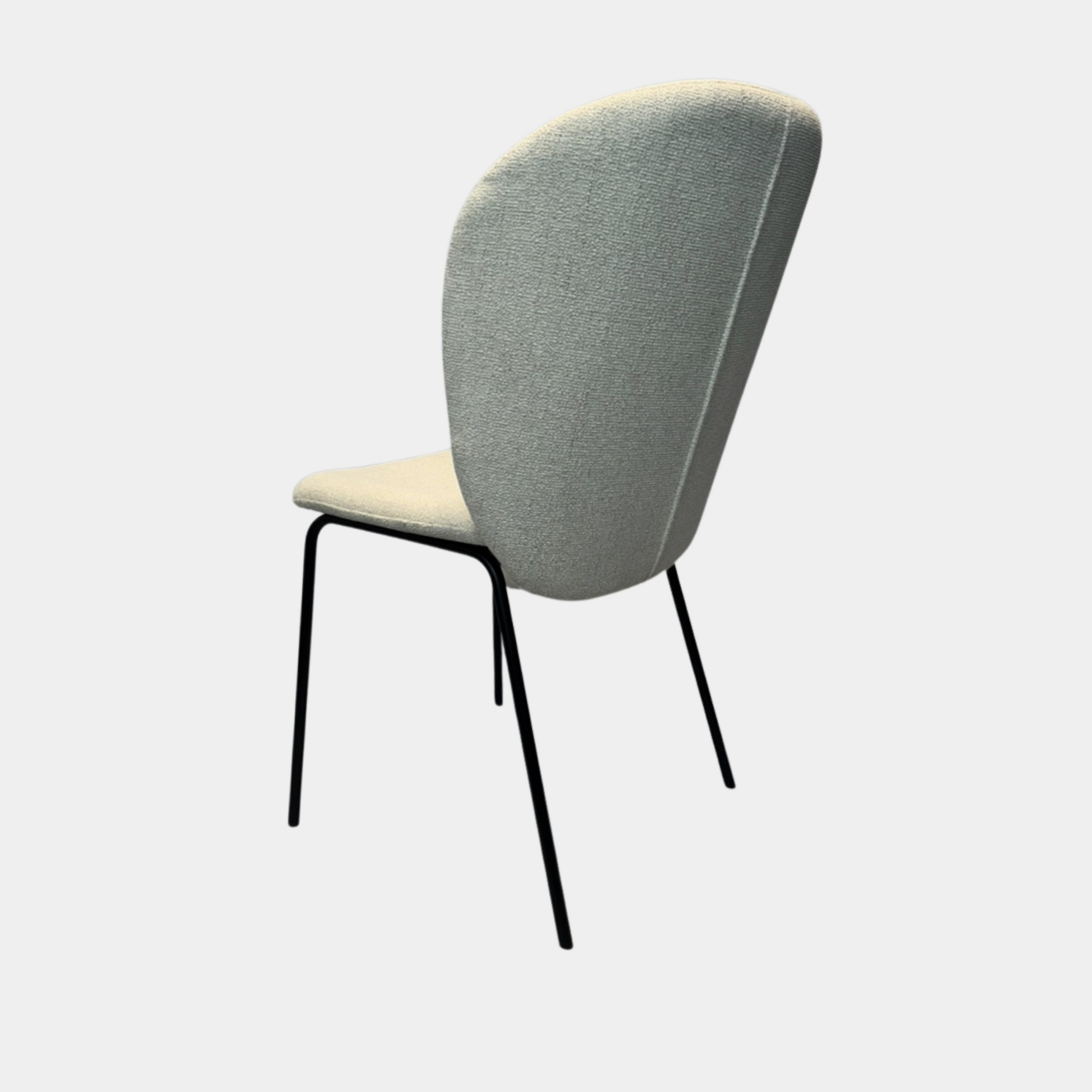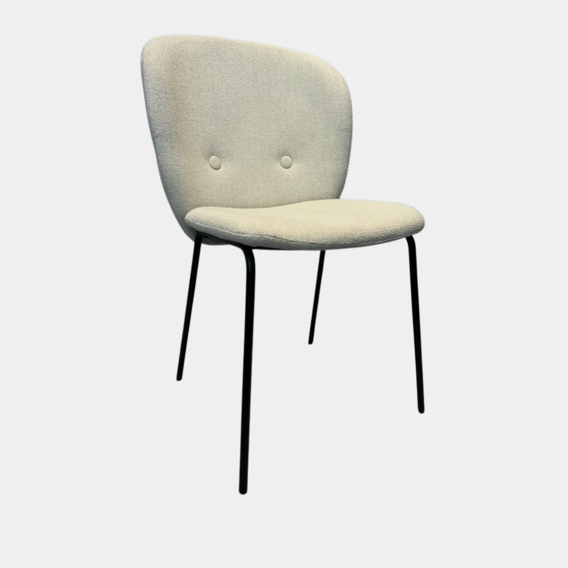 Verhoilu on vaaleaa, miellyttävän tuntuista kangasta, joka tuo tilaan valoa ja rauhaa. Musta metallirunko tekee rakenteesta kevyen ja vakaan – tuoli sopii erinomaisesti ruokapöydän ääreen, työtuoliksi tai osaksi viihtyisää lukunurkkausta.